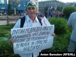 В отличие от митинга, который провели новосибирские профсоюзы накануне, главной темой сегодняшней акции стало требование отставки президента России Владимира Путина. Собравшиеся считают его персонально ответственным за попытку увеличить возраст выхода не пенсию. Его обвинили в том, что вместо модернизации экономики в годы высоких цен на нефть, государство фактически ничего не делало, позволив получать сверхдоходы группе бизнесменов, приближенных к Кремлю. "Когда нефть подешевела и мы пустились в военные авантюры в Украине и в Сирии, денег просто не стало. У нас сейчас пенсионный дефолт. И я обвиняю Путина в первую очередь, а потом Медведева. Потому что руководит нашим кораблем Путин, а Медведев просто механик, который выполняет поручения капитана", – заявила руководитель региональной организации "Яблока" Светлана Каверзина. Участники акции протеста приветствовали ее слова овацией и начали скандировать: "В отставку! В отставку!".